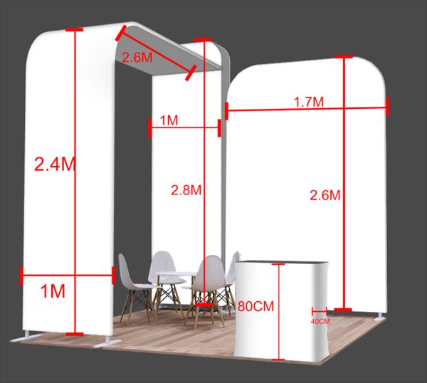 The rental package 3 has been shaped especially for businesses that involve industrial brands and hi-tech companies in their exhibitions. The package is specially designed to build up authority and give trust in trade events and expos. Graphic panels, an arch, and a reception counter are all planned to establish the first impression while communicating the muscular strength, reliability, and trustworthiness of your products or services.